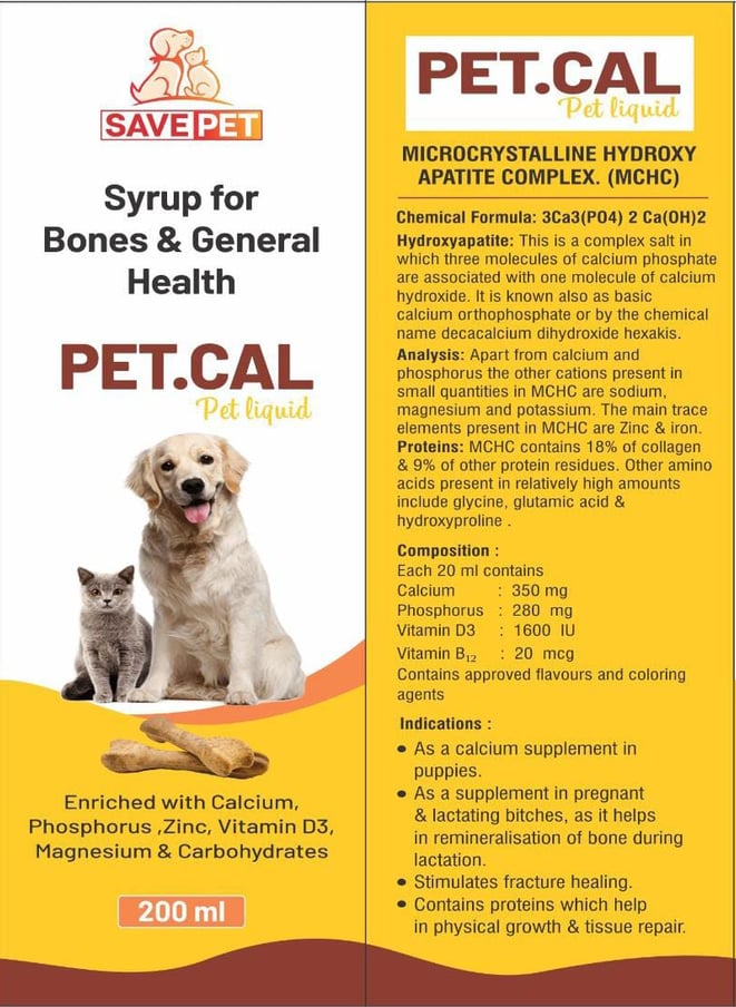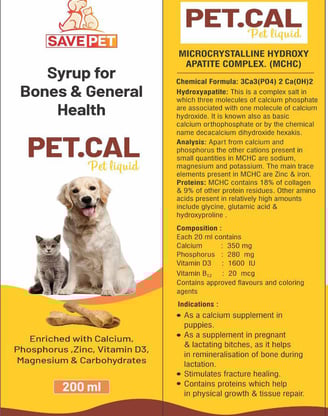 Pet.Cal is a specially formulated calcium supplement designed to support your pet's bone health, teeth strength, and overall vitality. Enriched with essential nutrients like Vitamin D3, it ensures optimal calcium absorption, helping your furry friends stay active and healthy.
