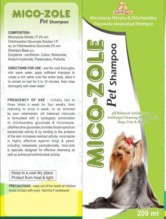 Micozole Pet Shampoo is a gentle yet effective antifungal and antibacterial shampoo designed to keep your pet's coat healthy and free from infections. Formulated with Miconazole and Chlorhexidine, it helps combat skin conditions like fungal infections, dandruff, and itching while leaving your pet's fur soft and shiny.