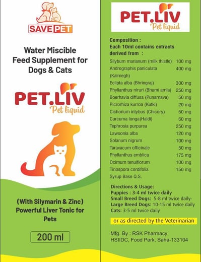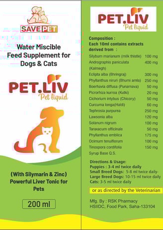 Pet.Liv is a powerful liver tonic designed to support and enhance your pet's liver health. Enriched with natural ingredients and essential nutrients, it aids in detoxification, promotes optimal digestion, and improves appetite. Pet.Liv is ideal for pets recovering from illnesses, medications, or dietary imbalances, ensuring they bounce back to their energetic selves.