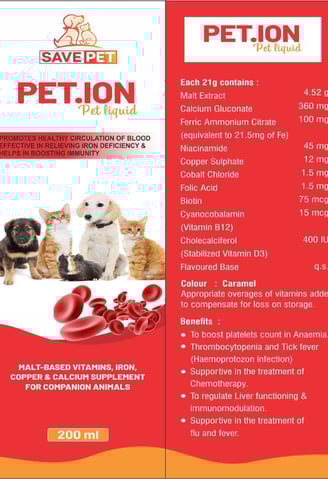 Pet.Ion is a specialized electrolyte supplement designed to keep your pets hydrated and energized. Perfect for pets during recovery, hot weather, or physical activity, this formula replenishes essential electrolytes, prevents dehydration, and promotes overall well-being. With a palatable taste, it’s easy to administer and ensures your furry friends stay active and healthy.